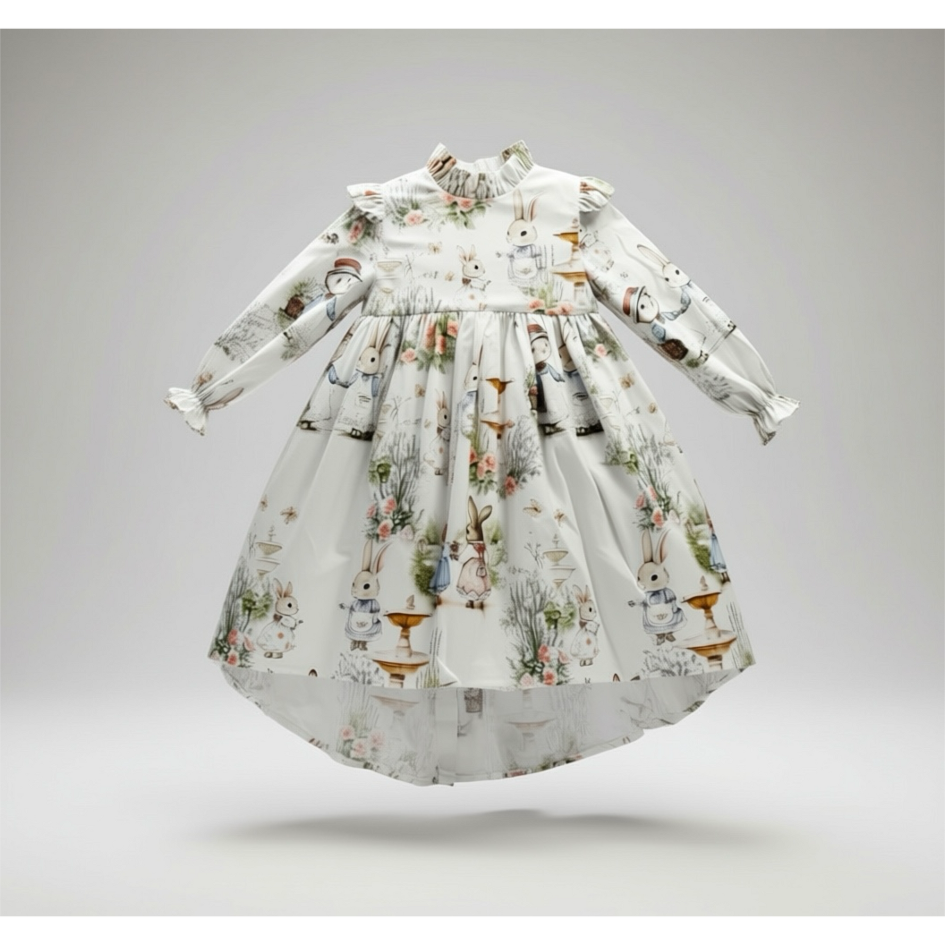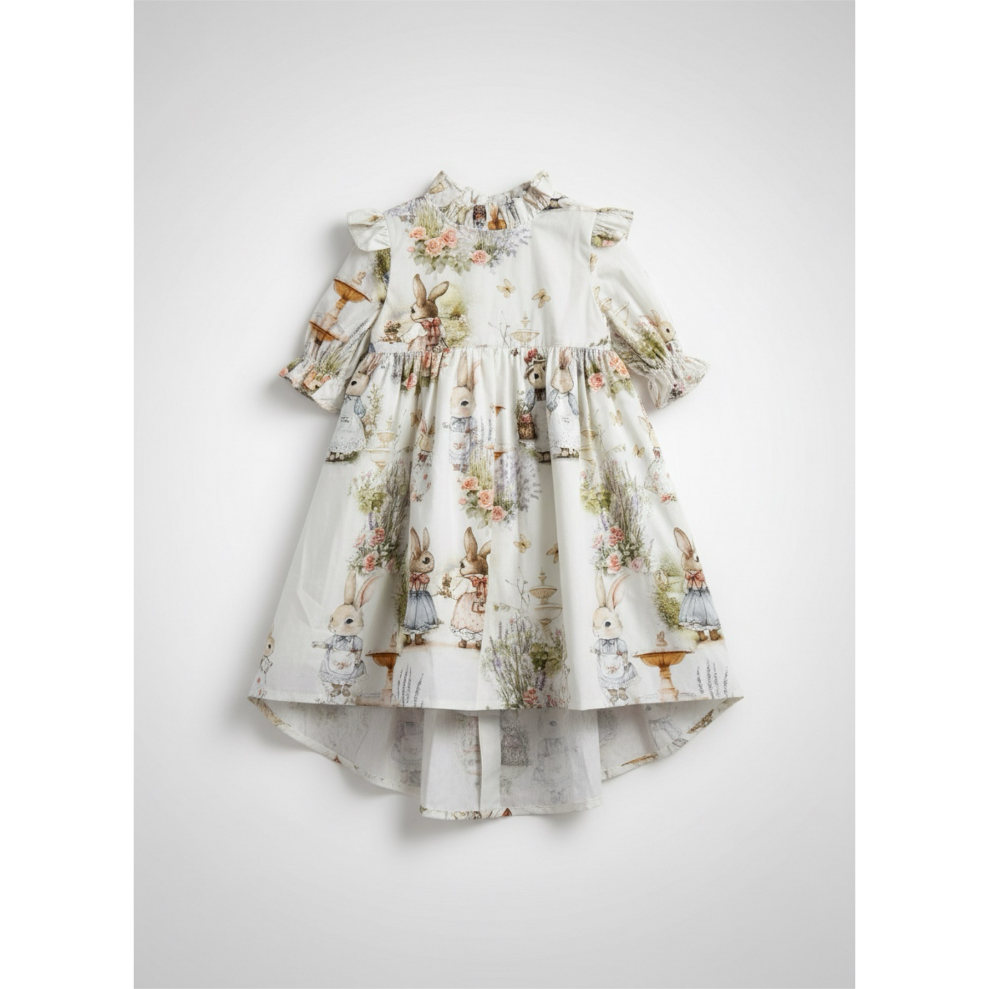 The Bramble Rabbit print features delicate woodland rabbits nestled among muted florals on a warm ivory ground. Soft tones of blush, sage, and faded blue create a refined heirloom palette that feels timeless rather than seasonal.