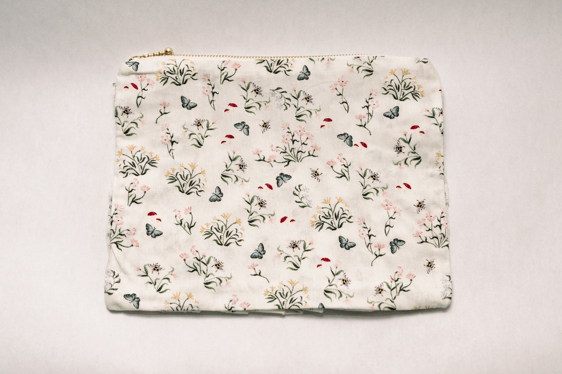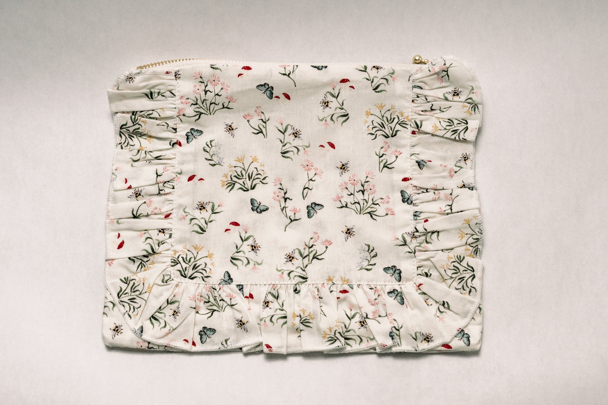 Butterfly Glade, a sweet blend of nostalgia and function. Tiny wildflowers and softly colored butterflies dance across recycled-cotton fabric, framed by gathered ruffles and finished with a smooth brass zipper. Just the right size for cosmetics, hair bows, pacifiers, or on-the-go essentials in your tote or diaper bags, adding vintage charm while keeping everything tidy.