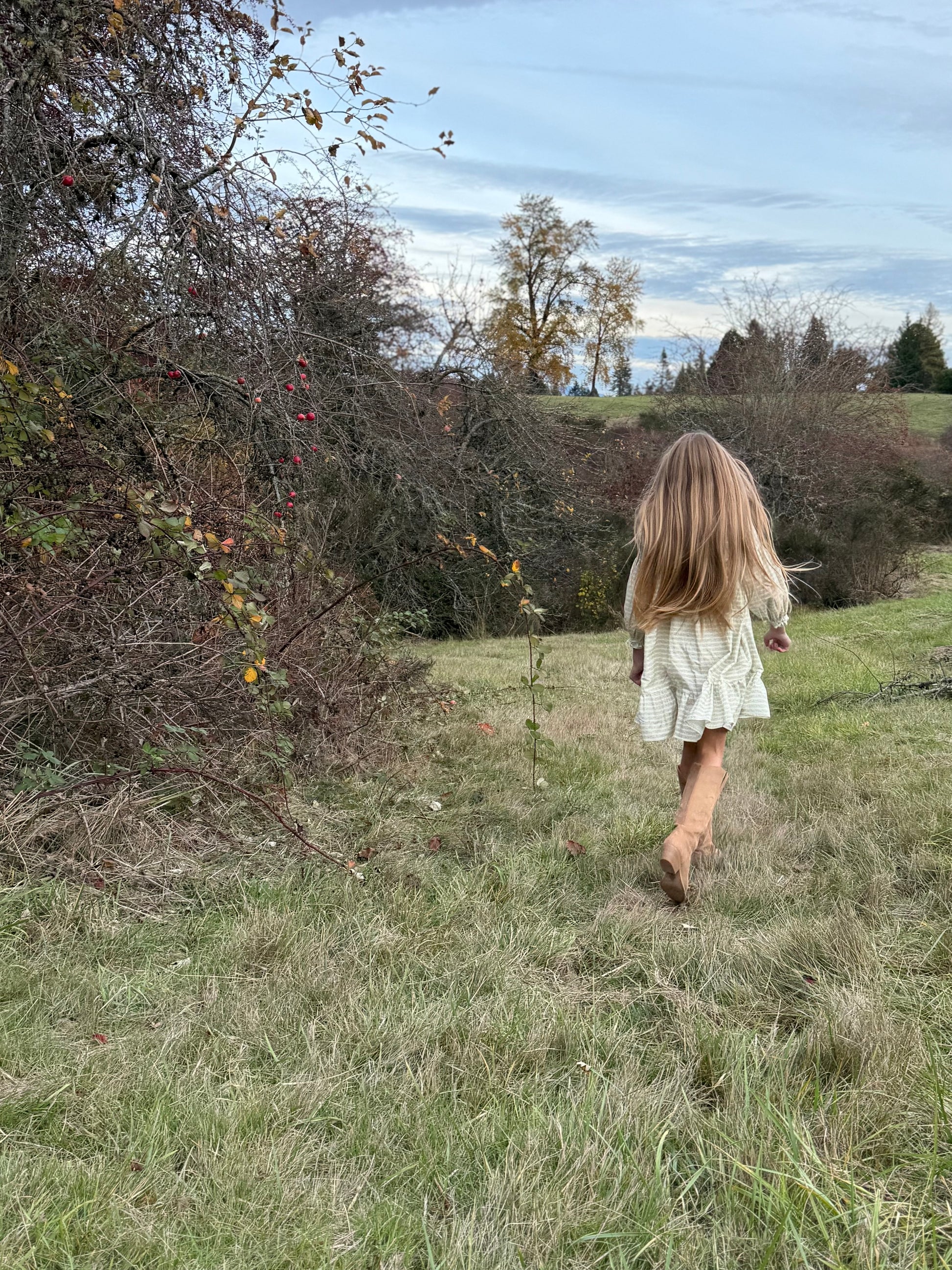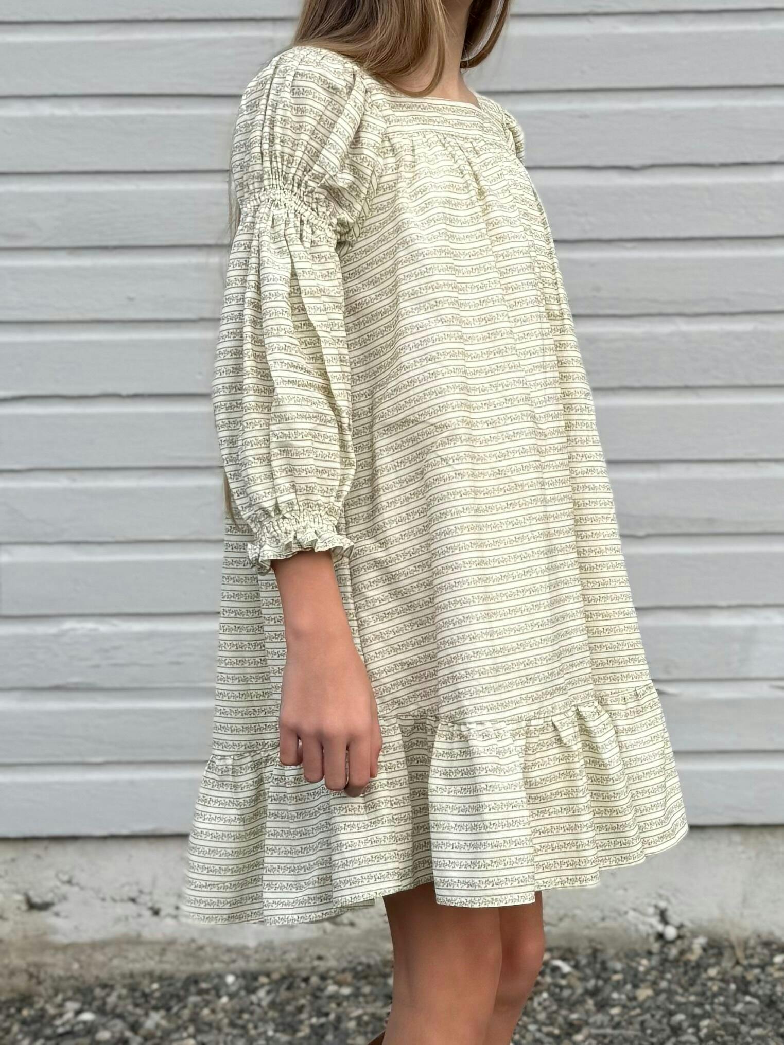 The Fiona Dress offers a classic and graceful design that supports easy movement and everyday wear. Crafted from 100% organic cotton with a delicate floral pattern, it features softly shirred sleeves, a ruffled hem, and a relaxed fit for maximum comfort. Ideal for playful twirls and mindful dressing, each dress is handmade without harmful dyes or chemicals, making it safe for sensitive skin.