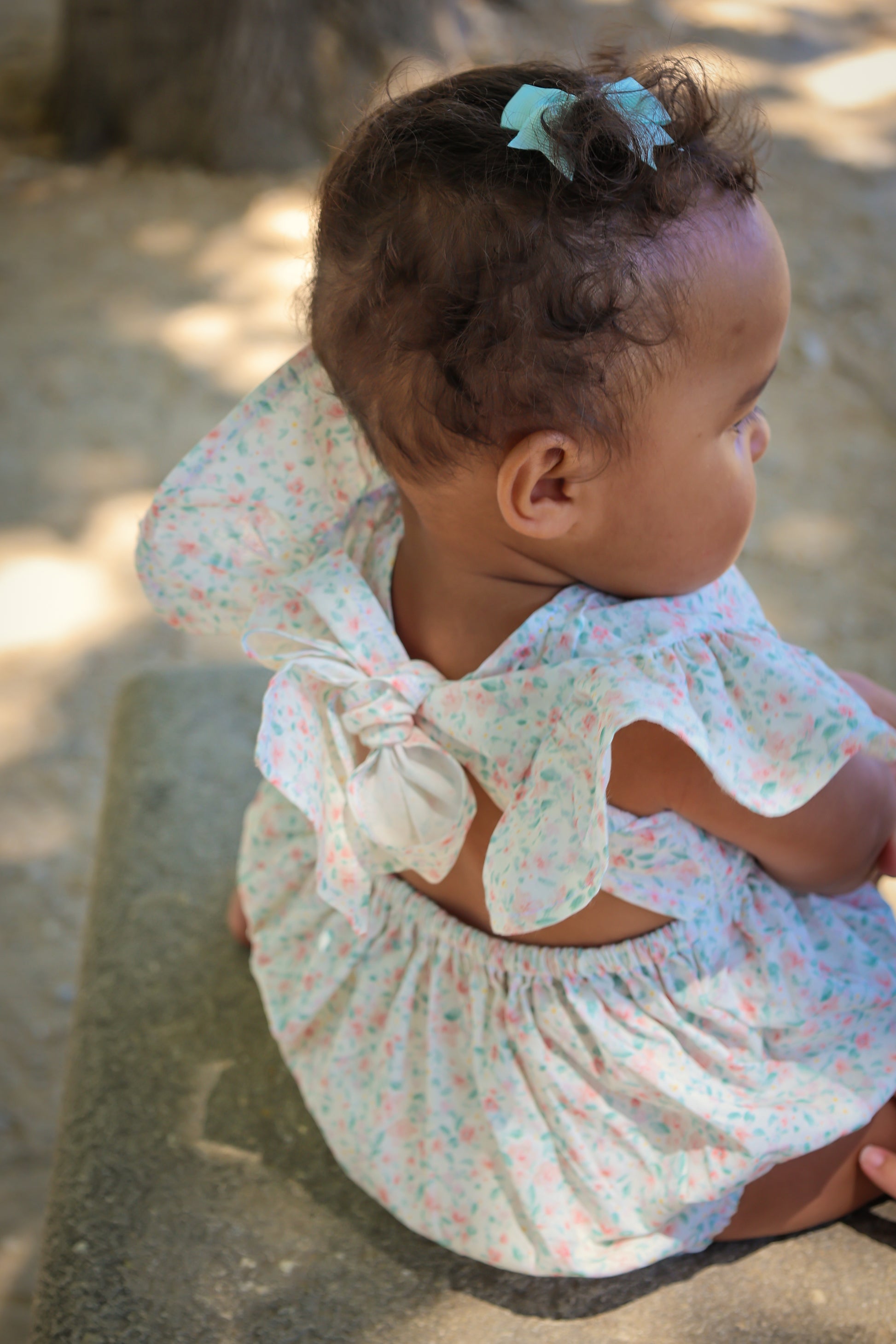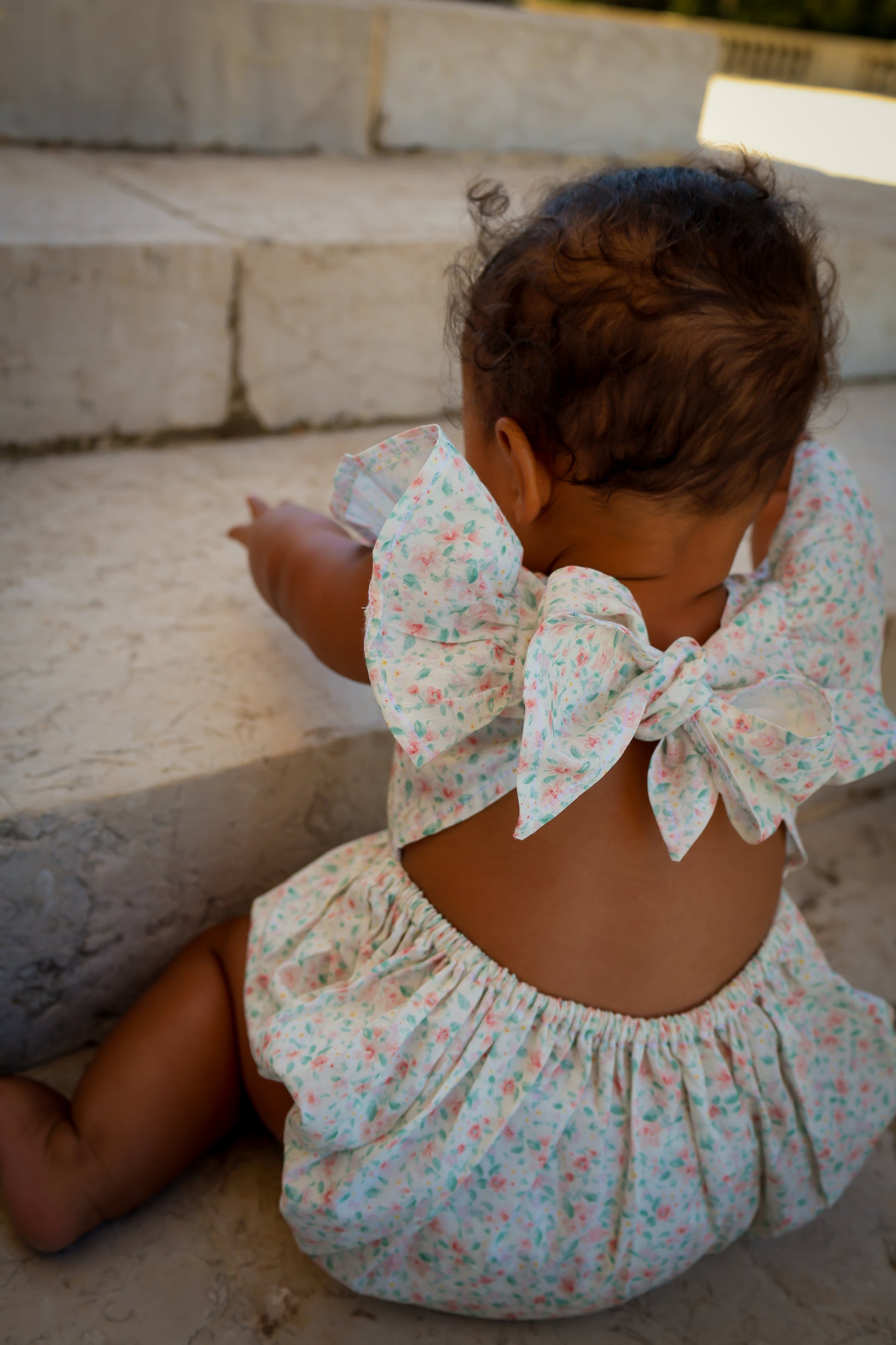 Find more flutter-sleeve bow-back rompers in the Josie Bubble Collection, including Golden Blossom, Soft Petals, Blue Meadow, Garden Blossom, and Lavender Fields.