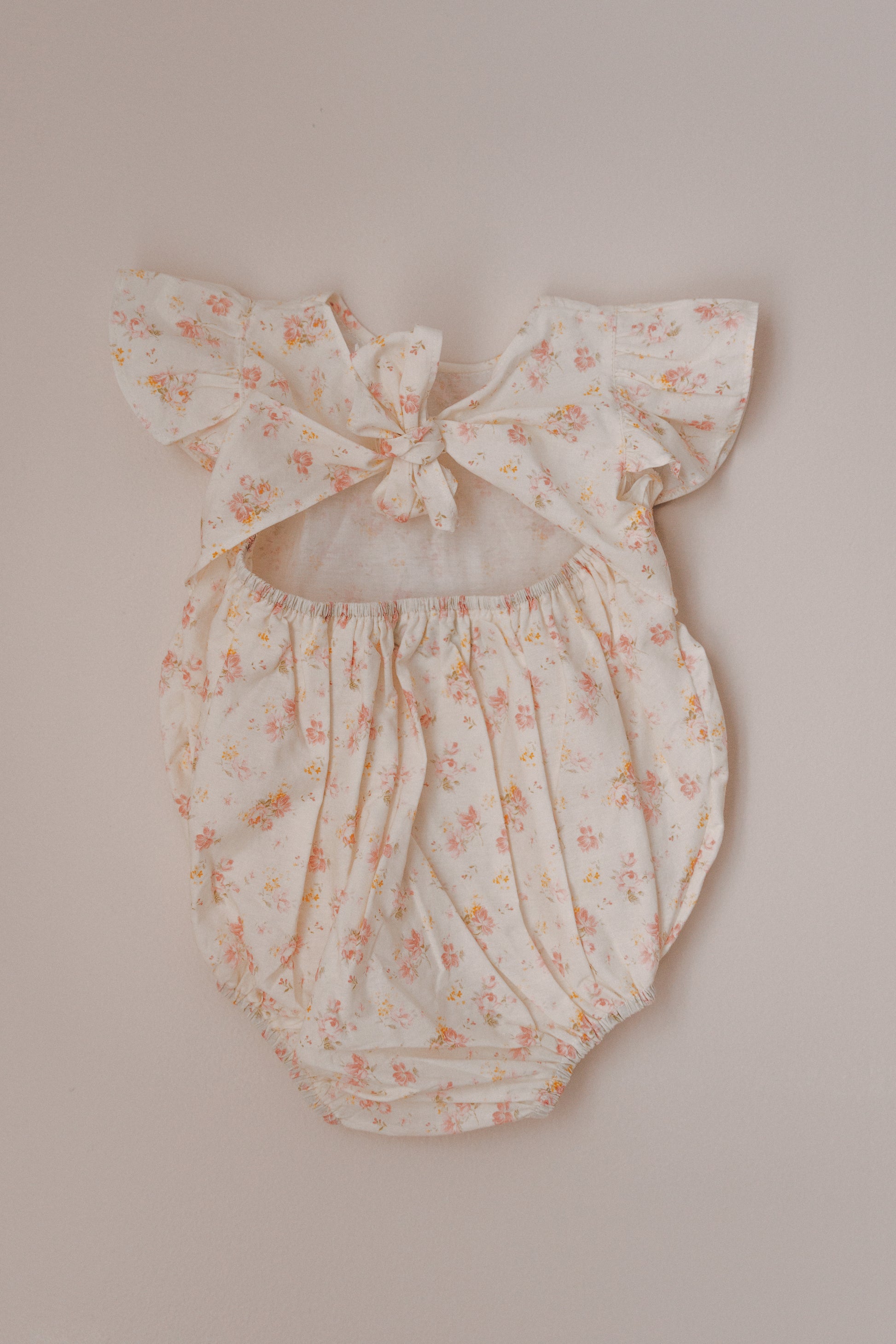 The Josie Bubble in Soft Petals is a sweet and airy romper designed for all-day comfort and charm. Delicate flutter sleeves frame the shoulders, while the open back is tied with a generous bow for a touch of whimsy. An elasticized waist and leg openings ensure a comfortable fit, and hidden snaps at the bottom make diaper changes quick and easy. Made from breathable cotton in a soft pink-and-yellow floral print, this bubble is perfect for warm-weather outings, birthdays, or simply enjoying sunny days in style.
