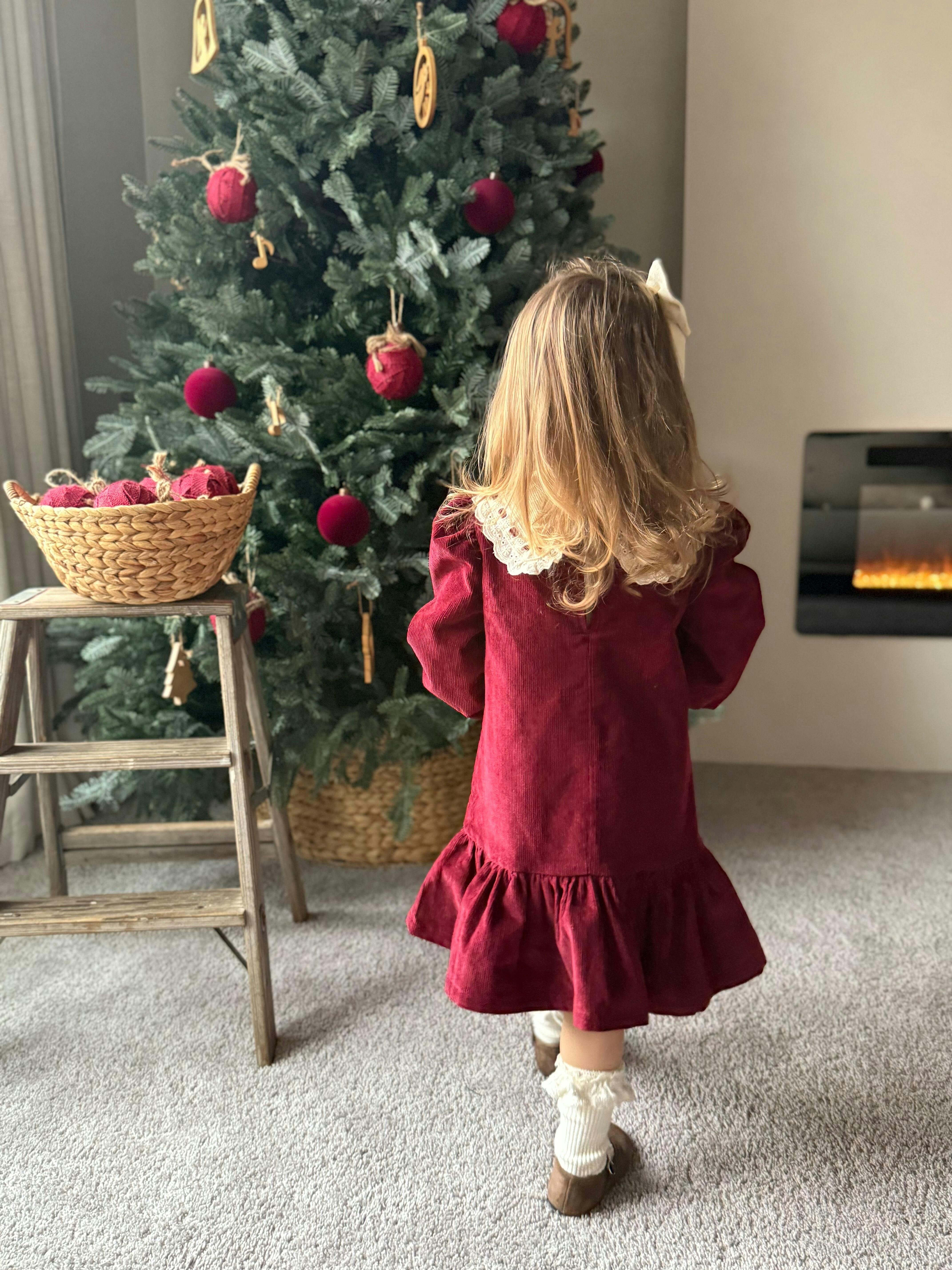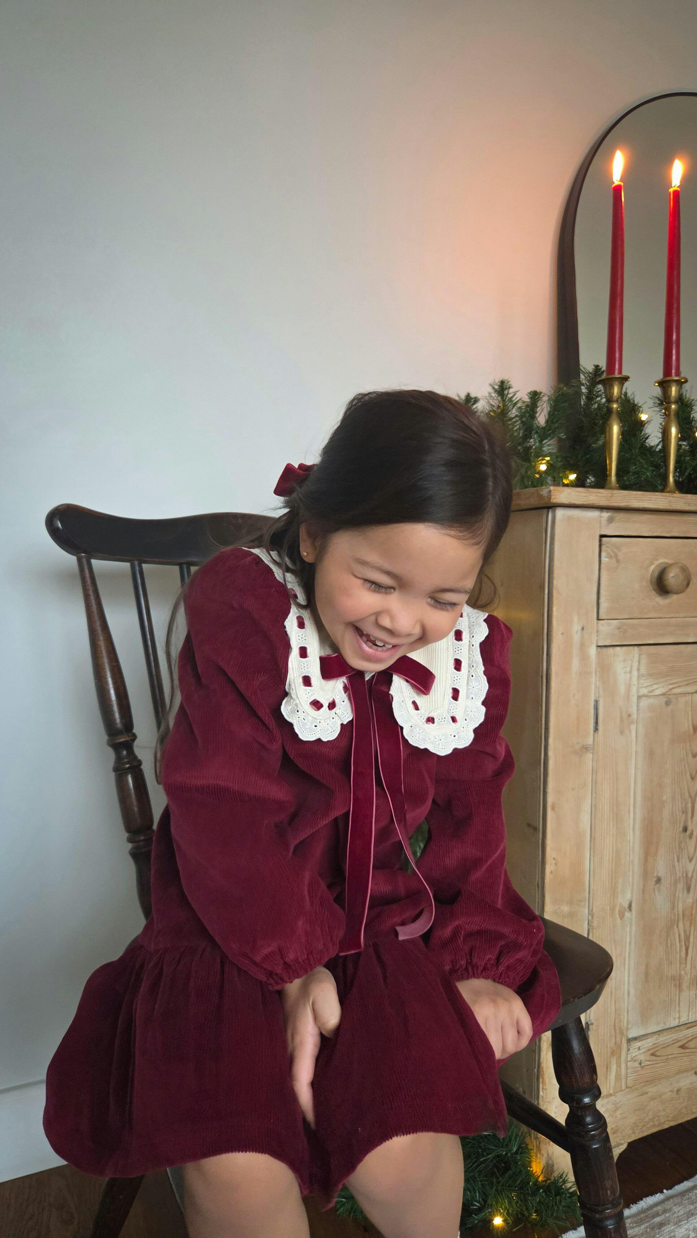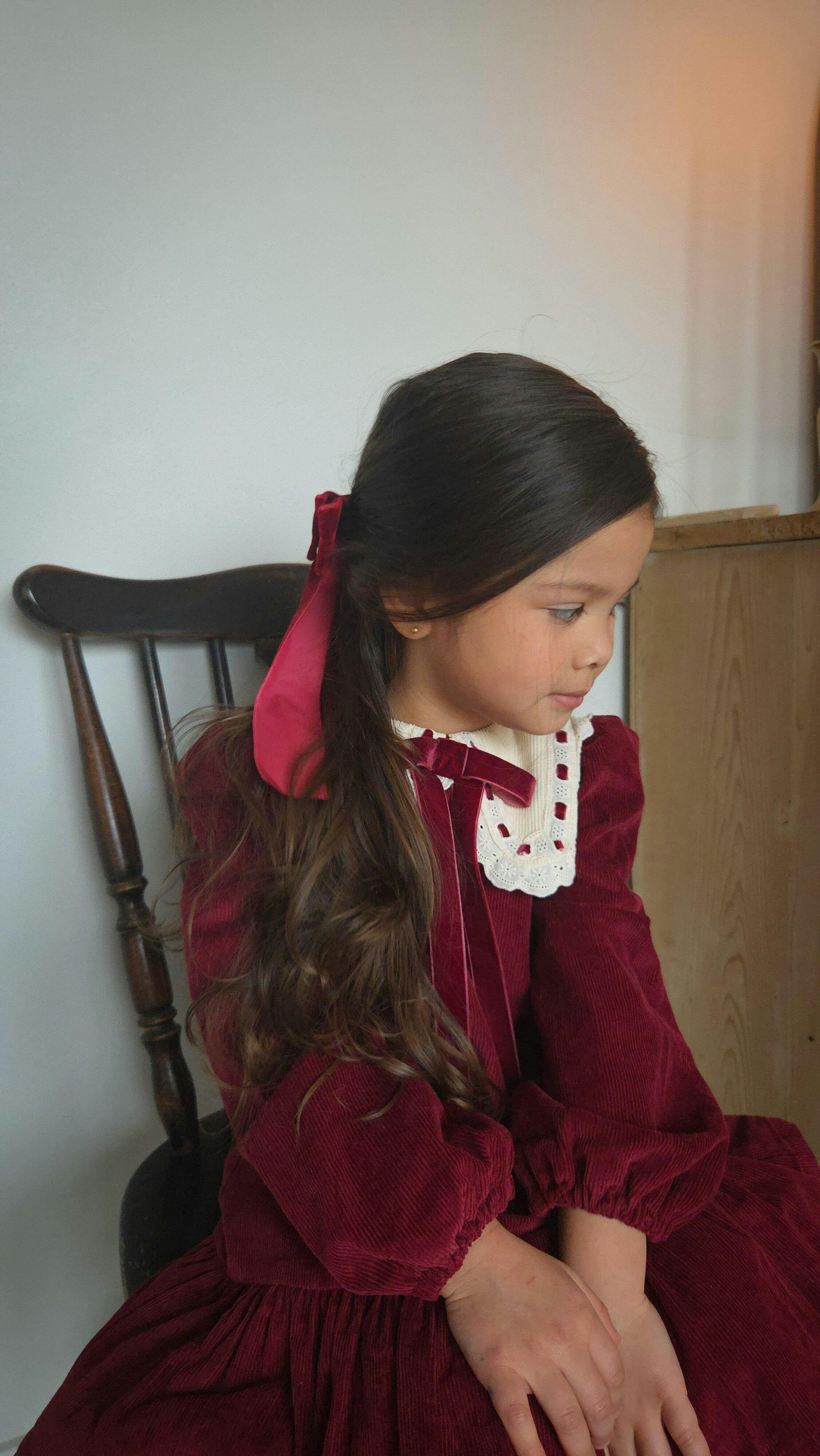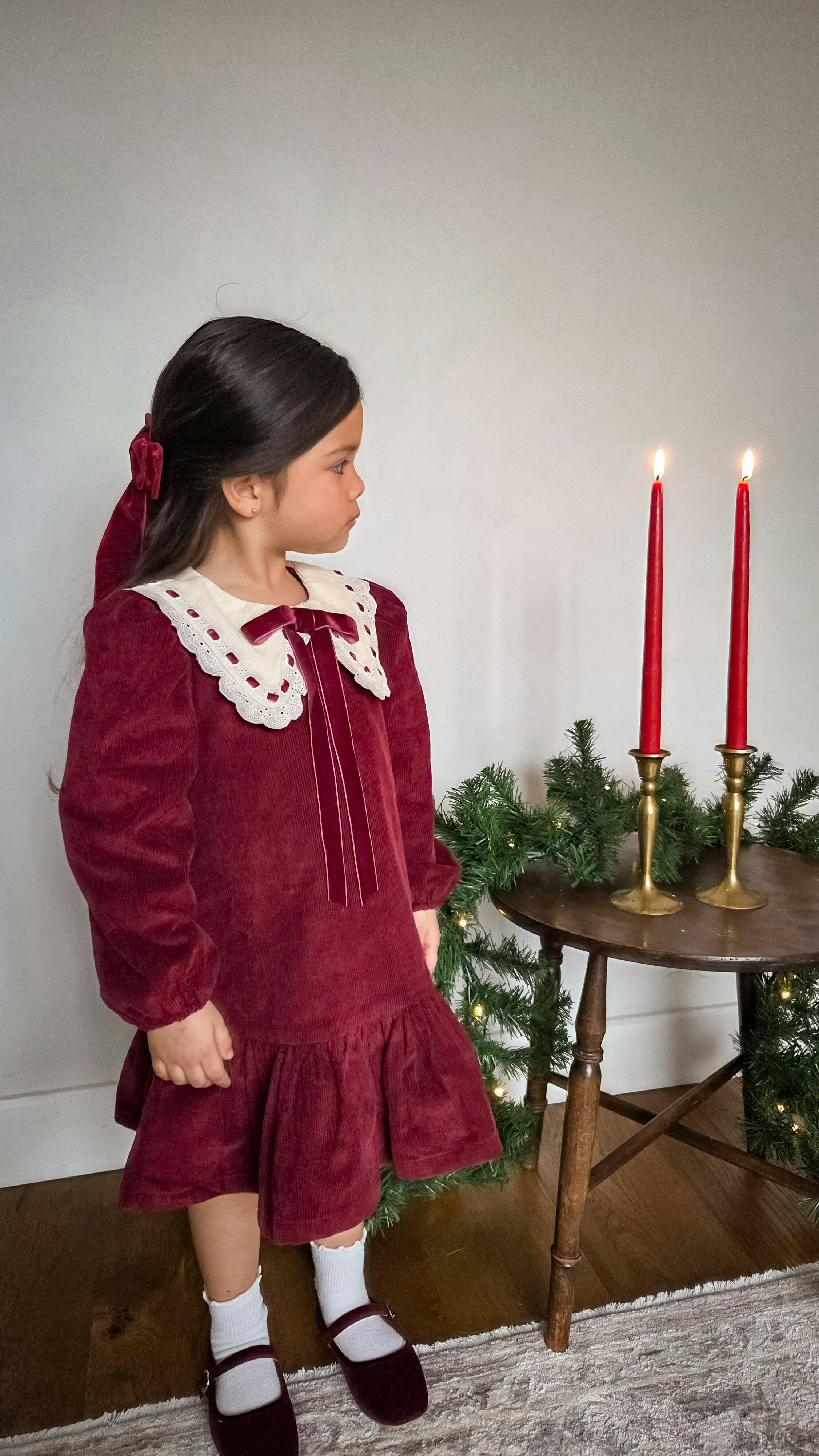 The Ophelia Dress is made from 100% cotton fine Wale Babycord, offering softness and durability. Its deep mulberry color, scalloped lace collar with velvet ribbon, and puffed sleeves create a vintage look. The drop-waist design flows into a ruffled hem for graceful movement. Fully lined for comfort, this dress is ideal for special occasions.
