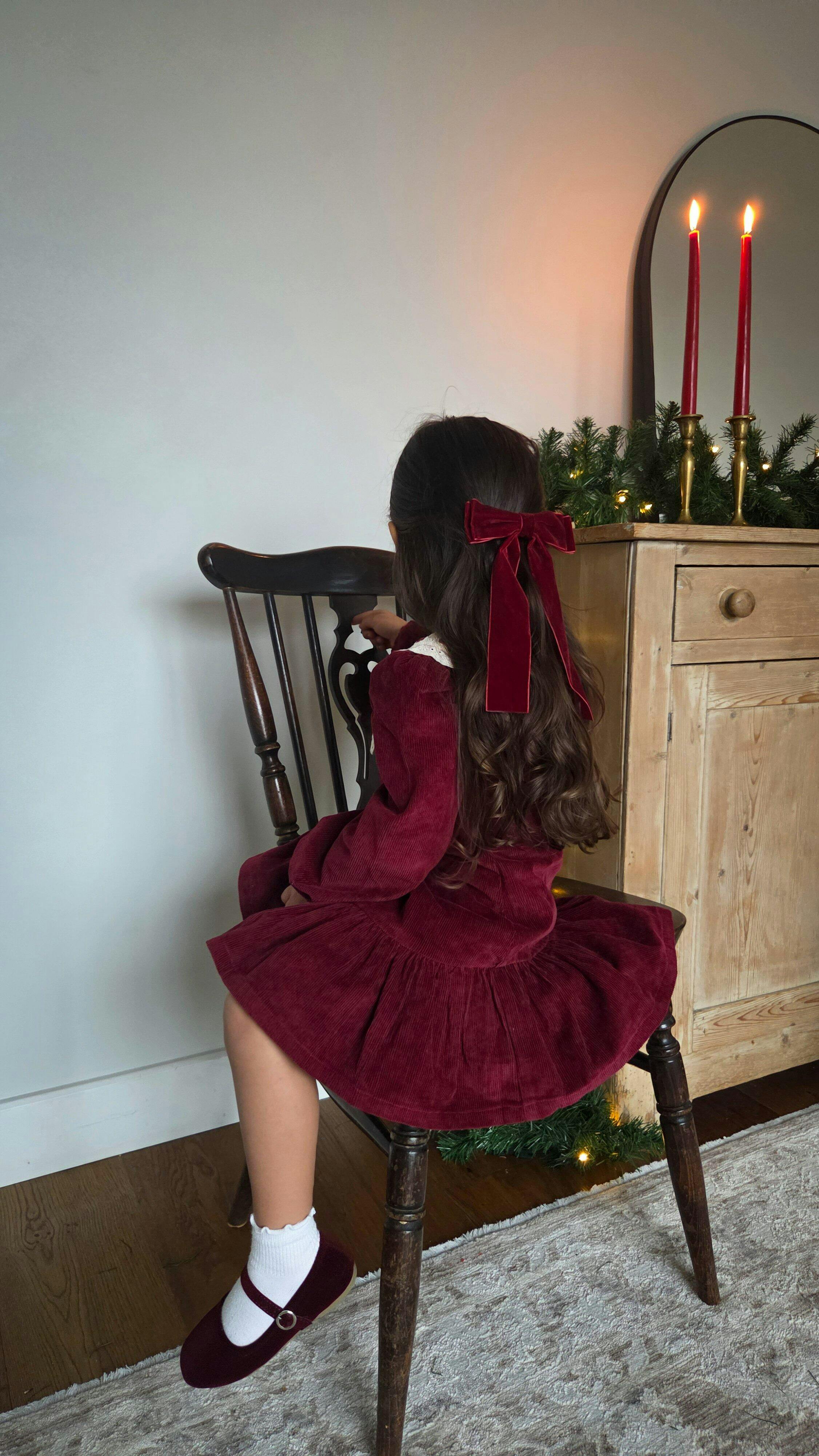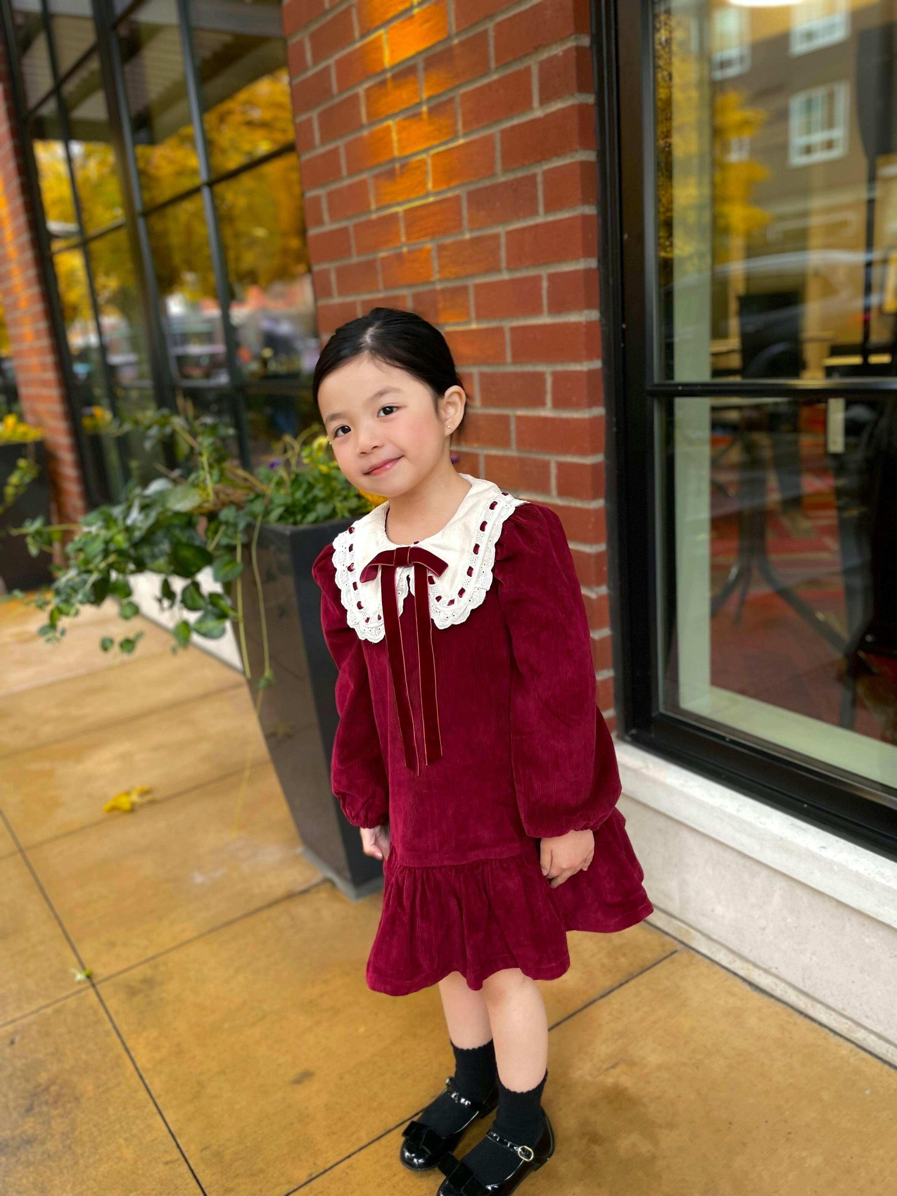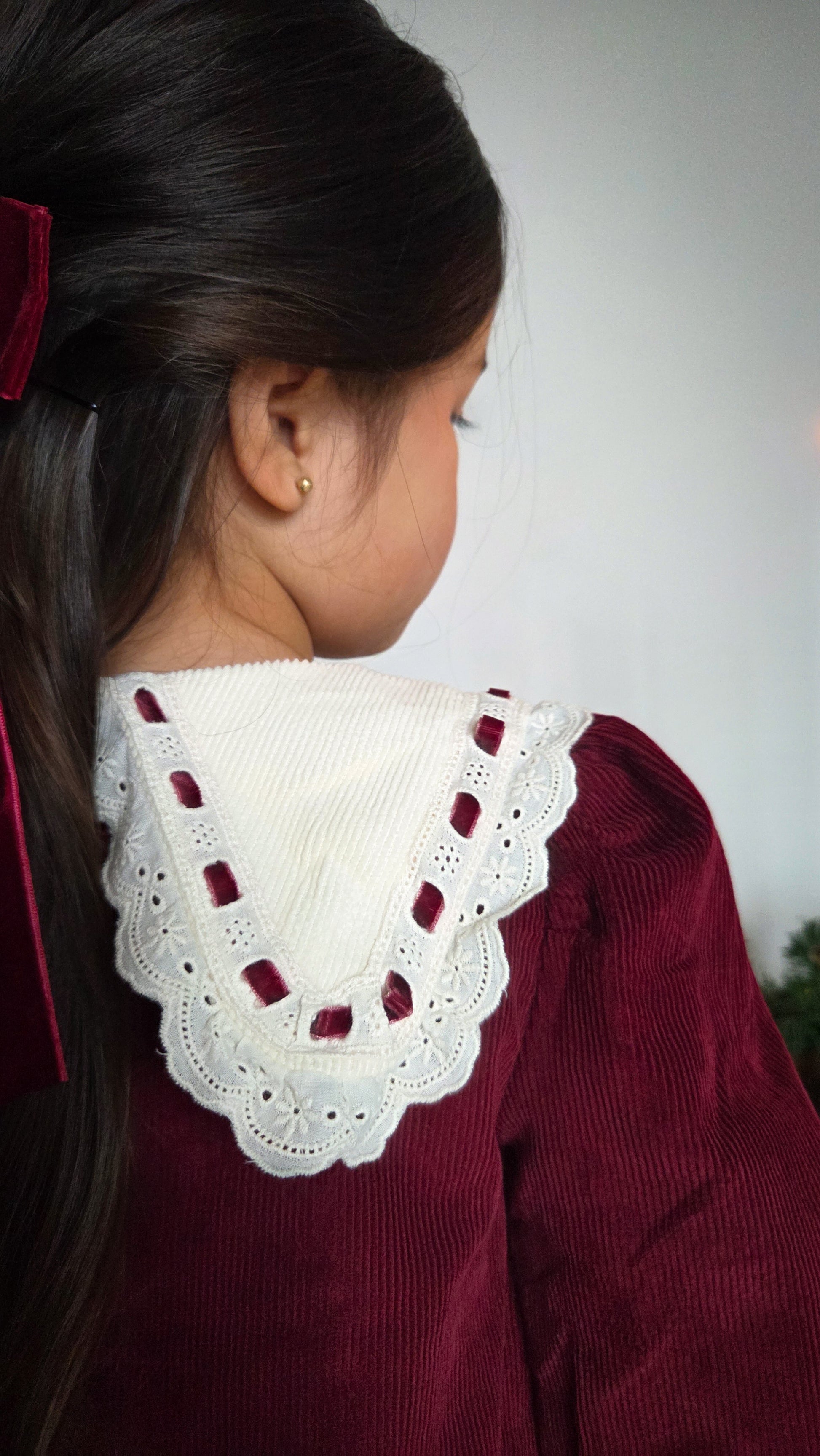 The Ophelia Dress is made from 100% cotton fine Wale Babycord, offering softness and durability. Its deep mulberry color, scalloped lace collar with velvet ribbon, and puffed sleeves create a vintage look. The drop-waist design flows into a ruffled hem for graceful movement. Fully lined for comfort, this dress is ideal for special occasions.