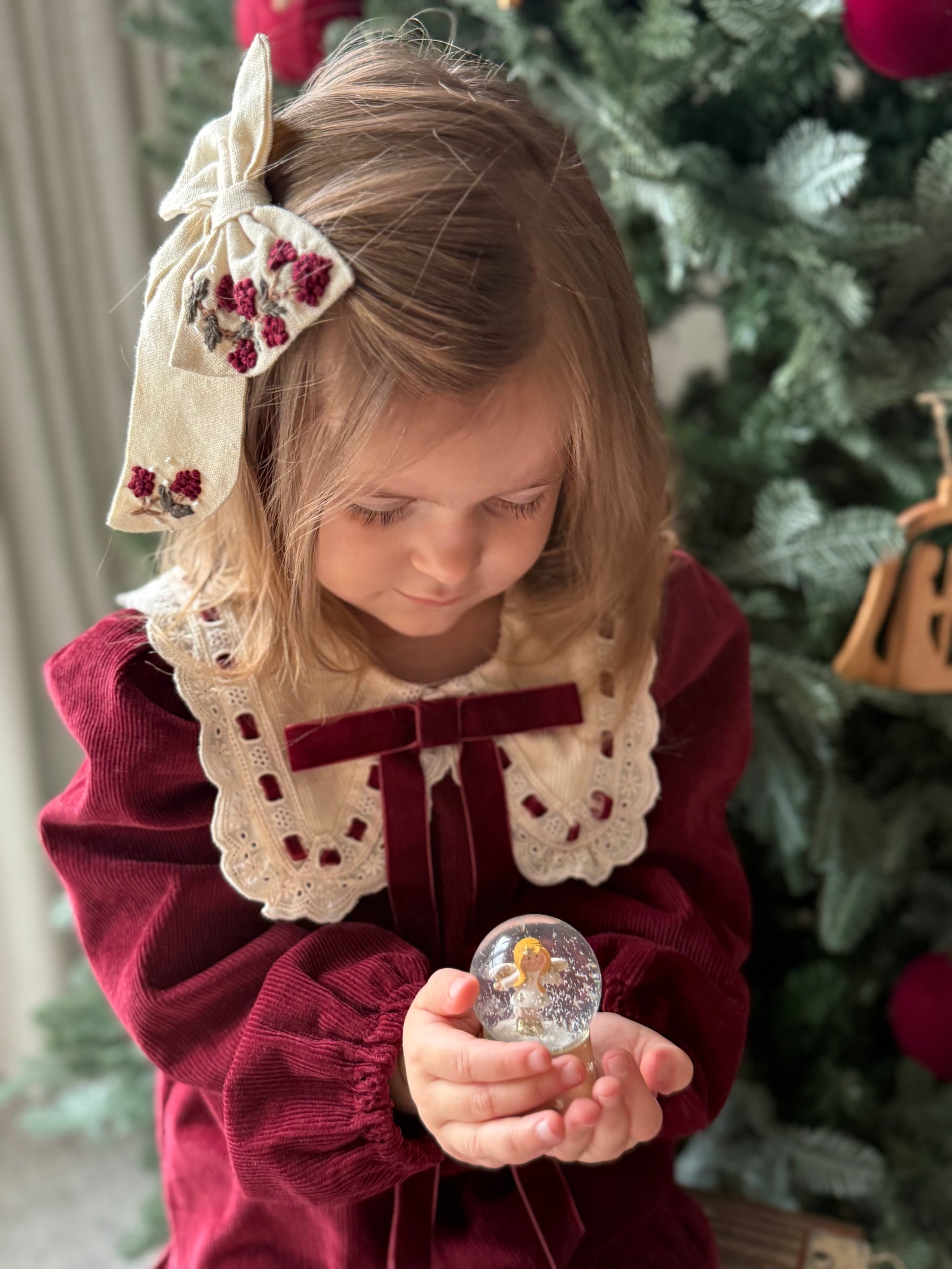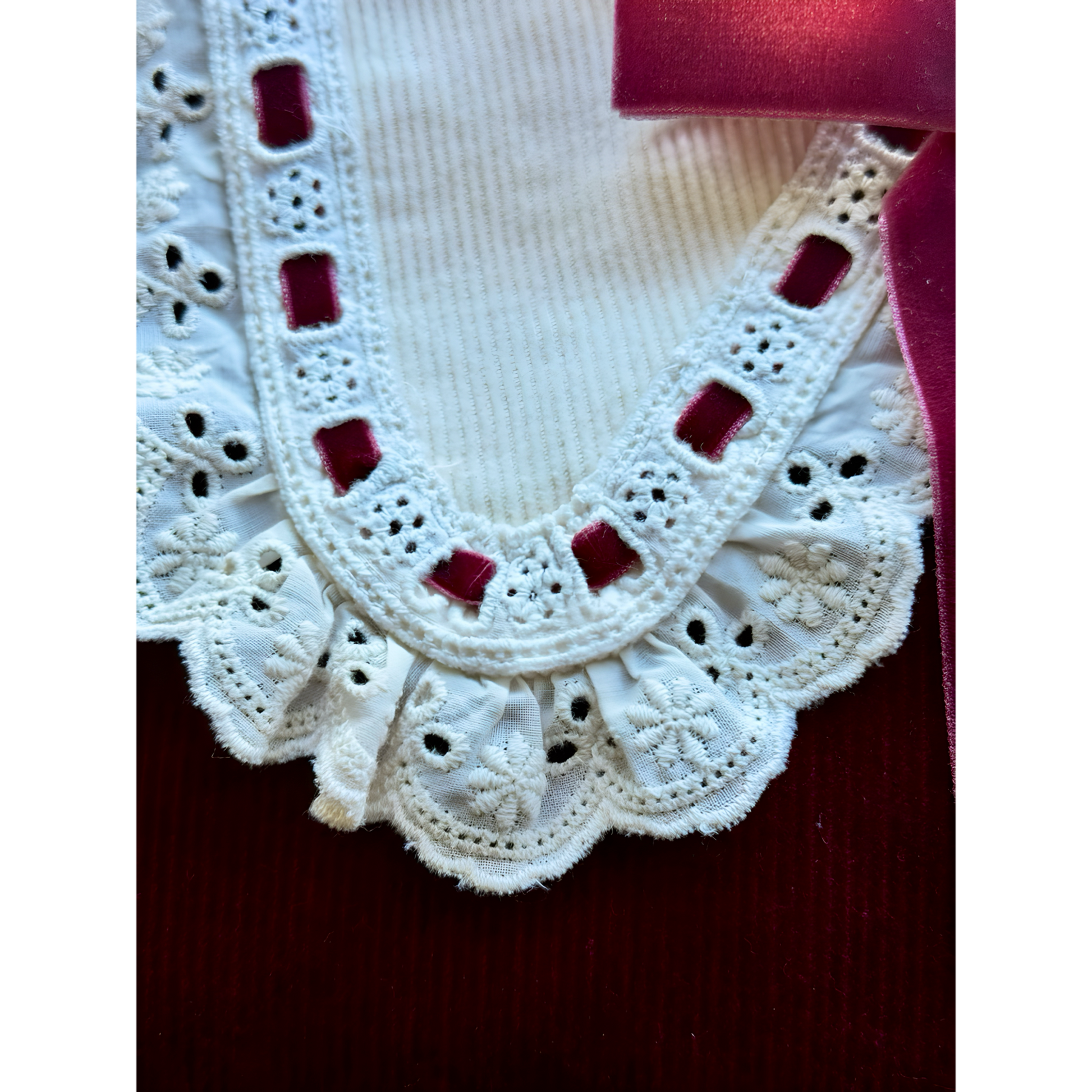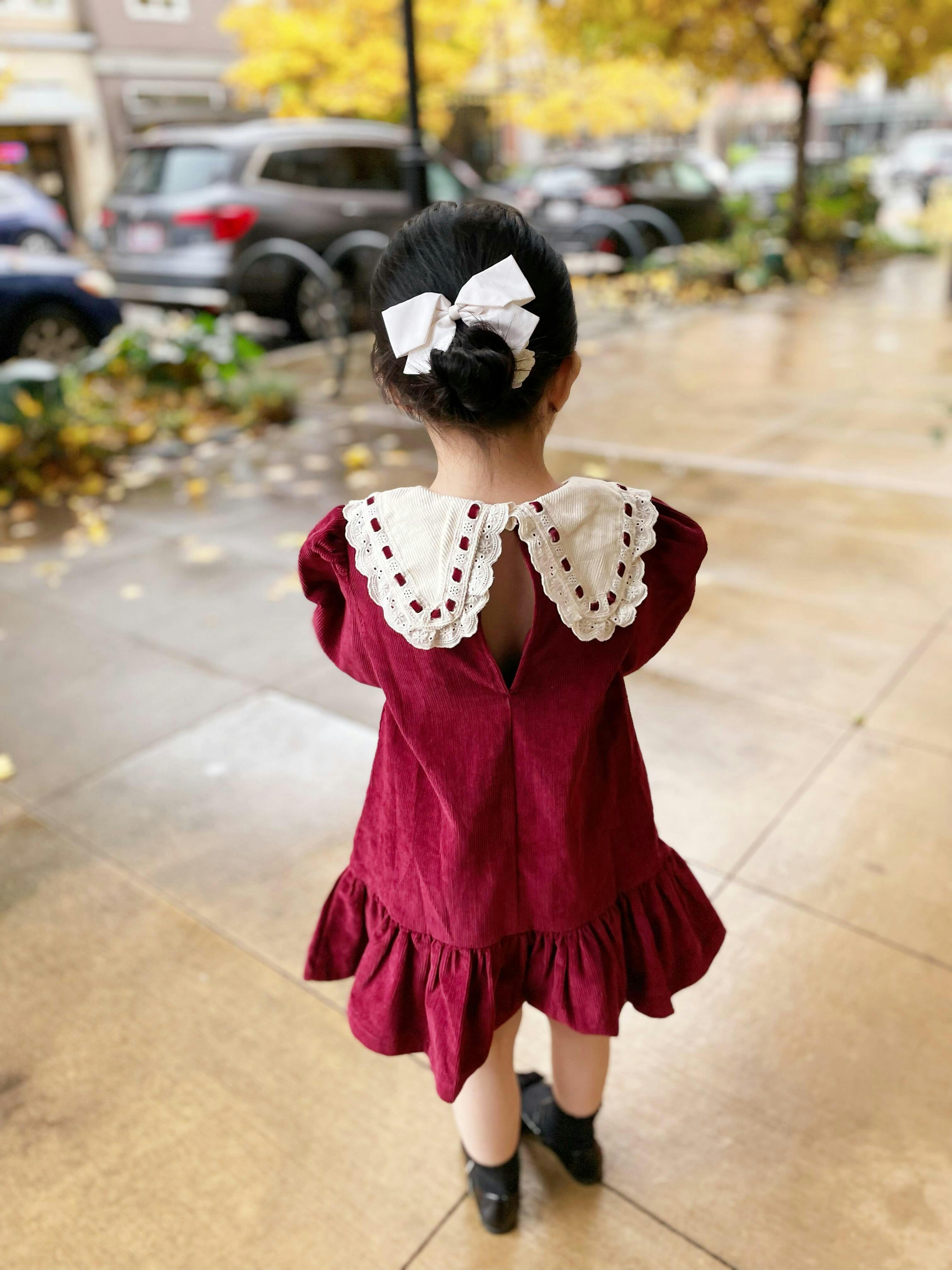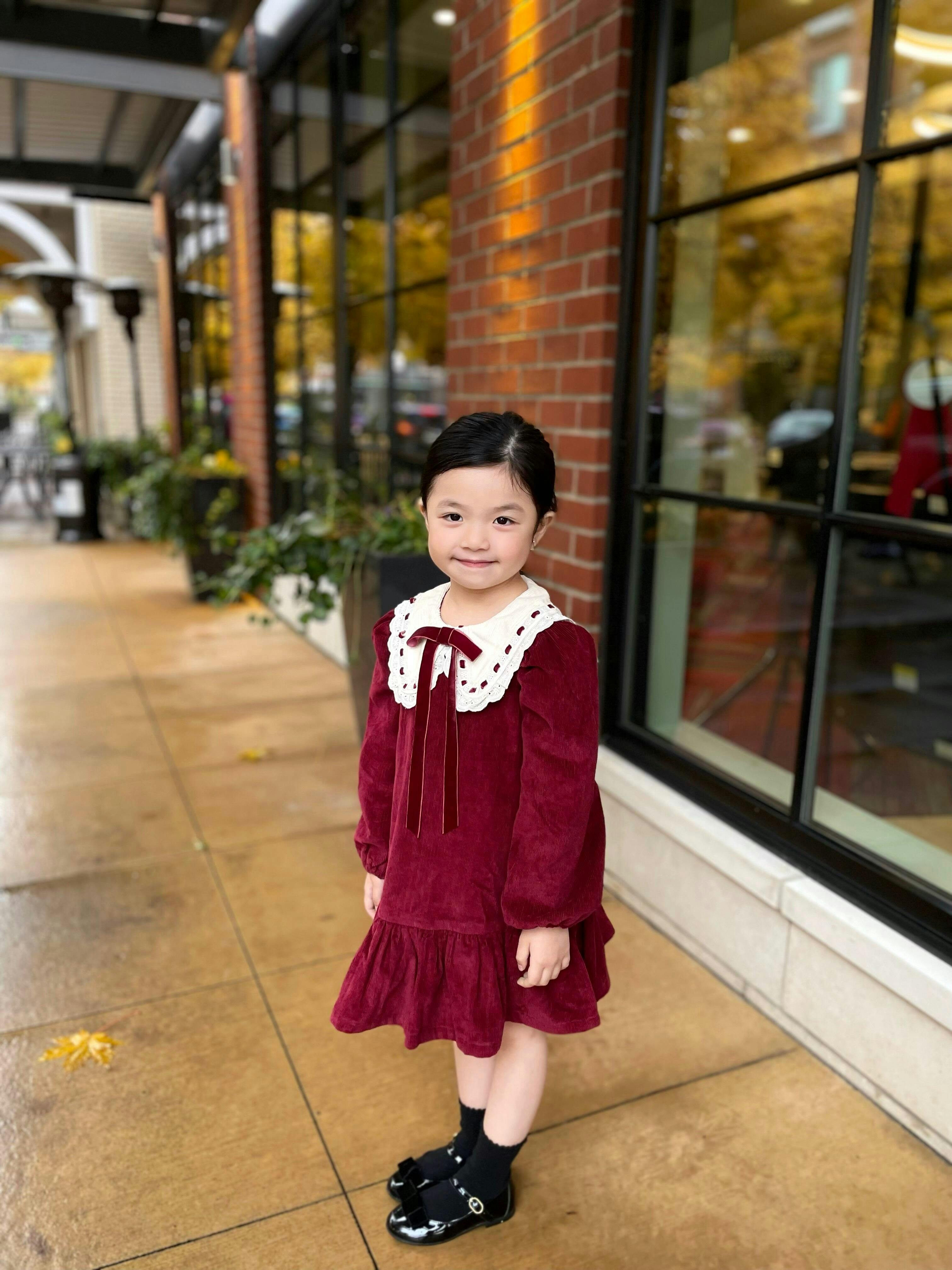 The Ophelia Dress is made from 100% cotton fine Wale Babycord, offering softness and durability. Its deep mulberry color, scalloped lace collar with velvet ribbon, and puffed sleeves create a vintage look. The drop-waist design flows into a ruffled hem for graceful movement. Fully lined for comfort, this dress is ideal for special occasions.