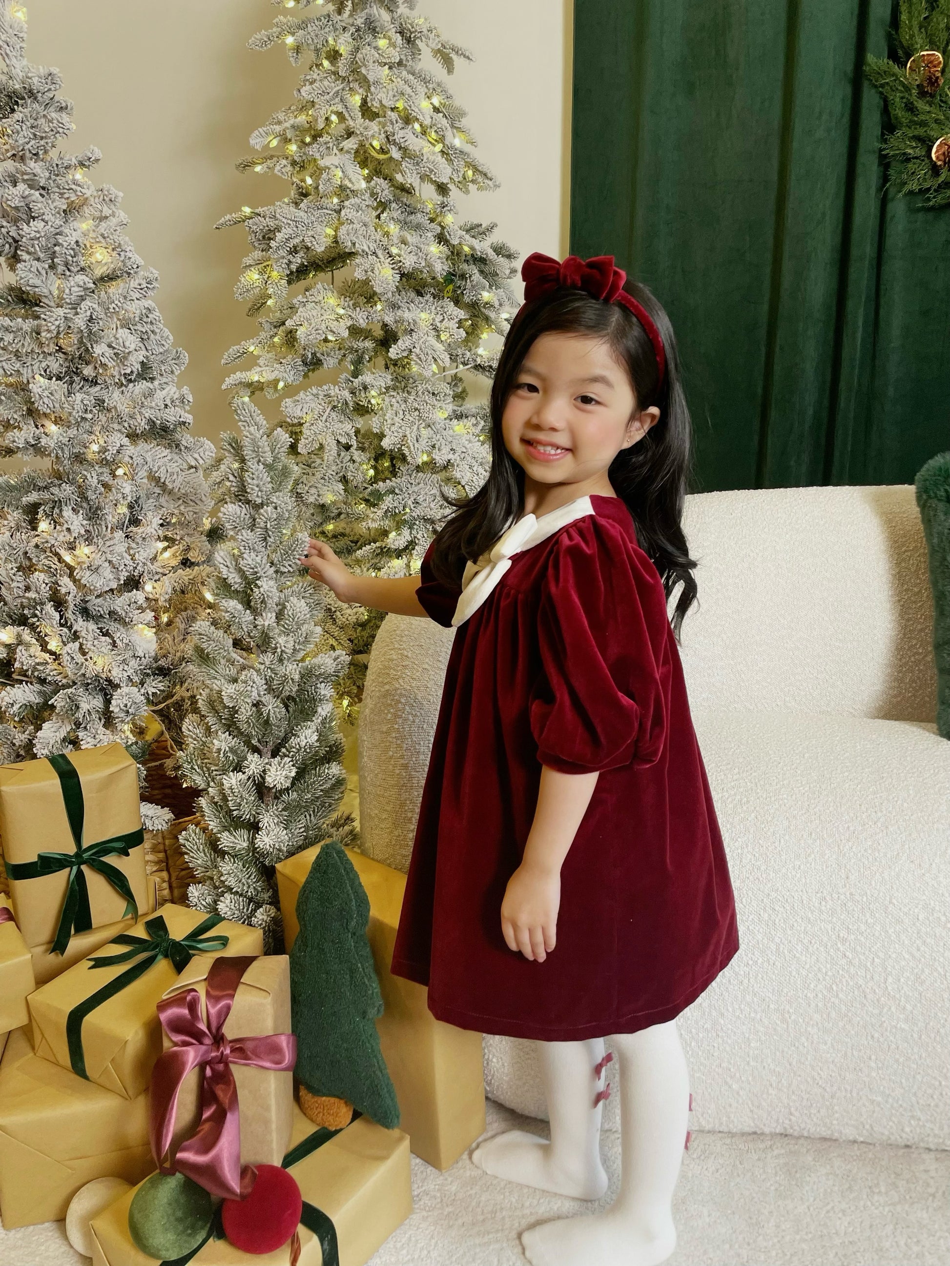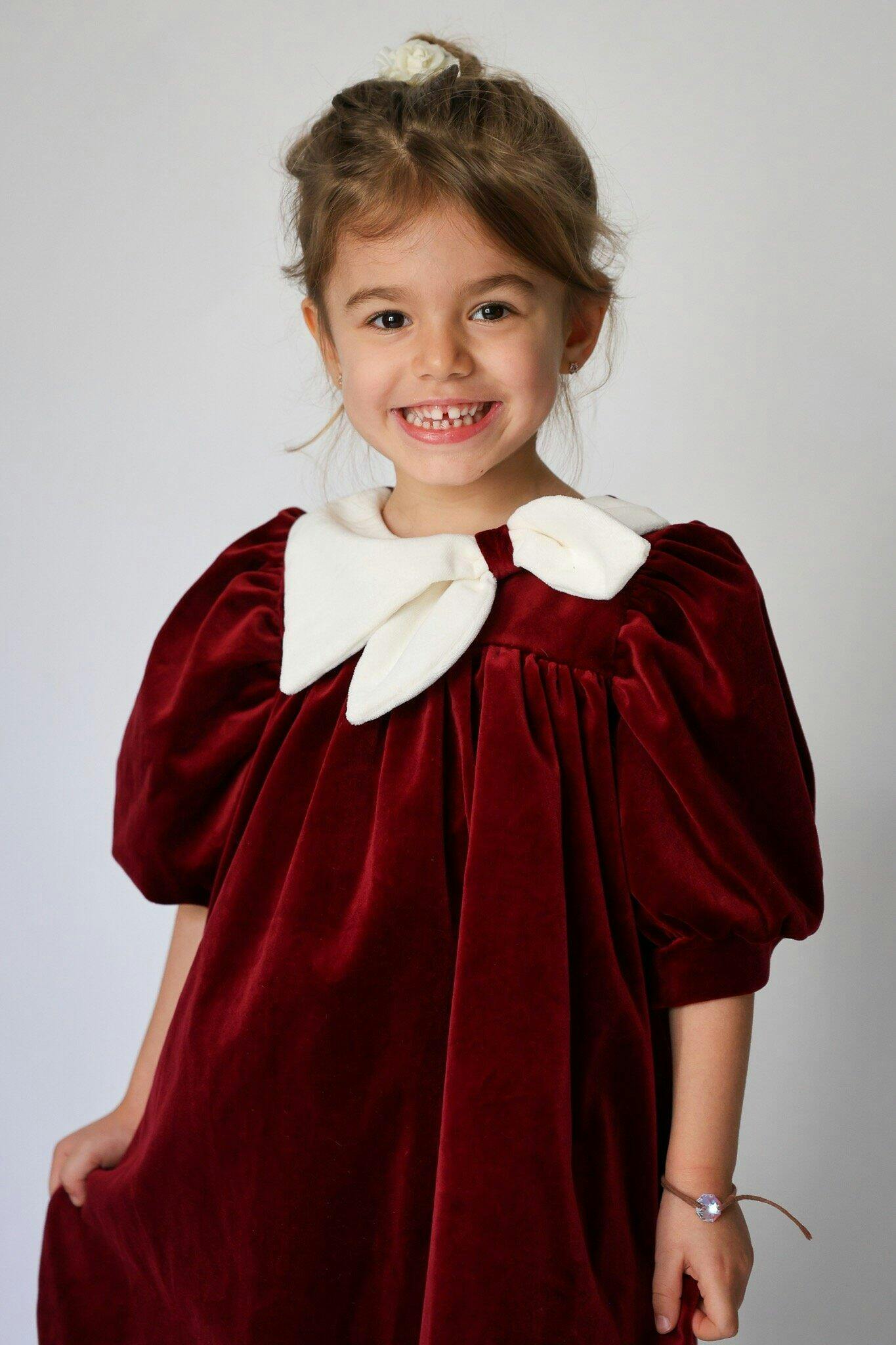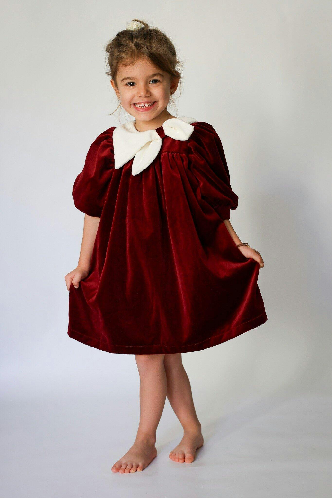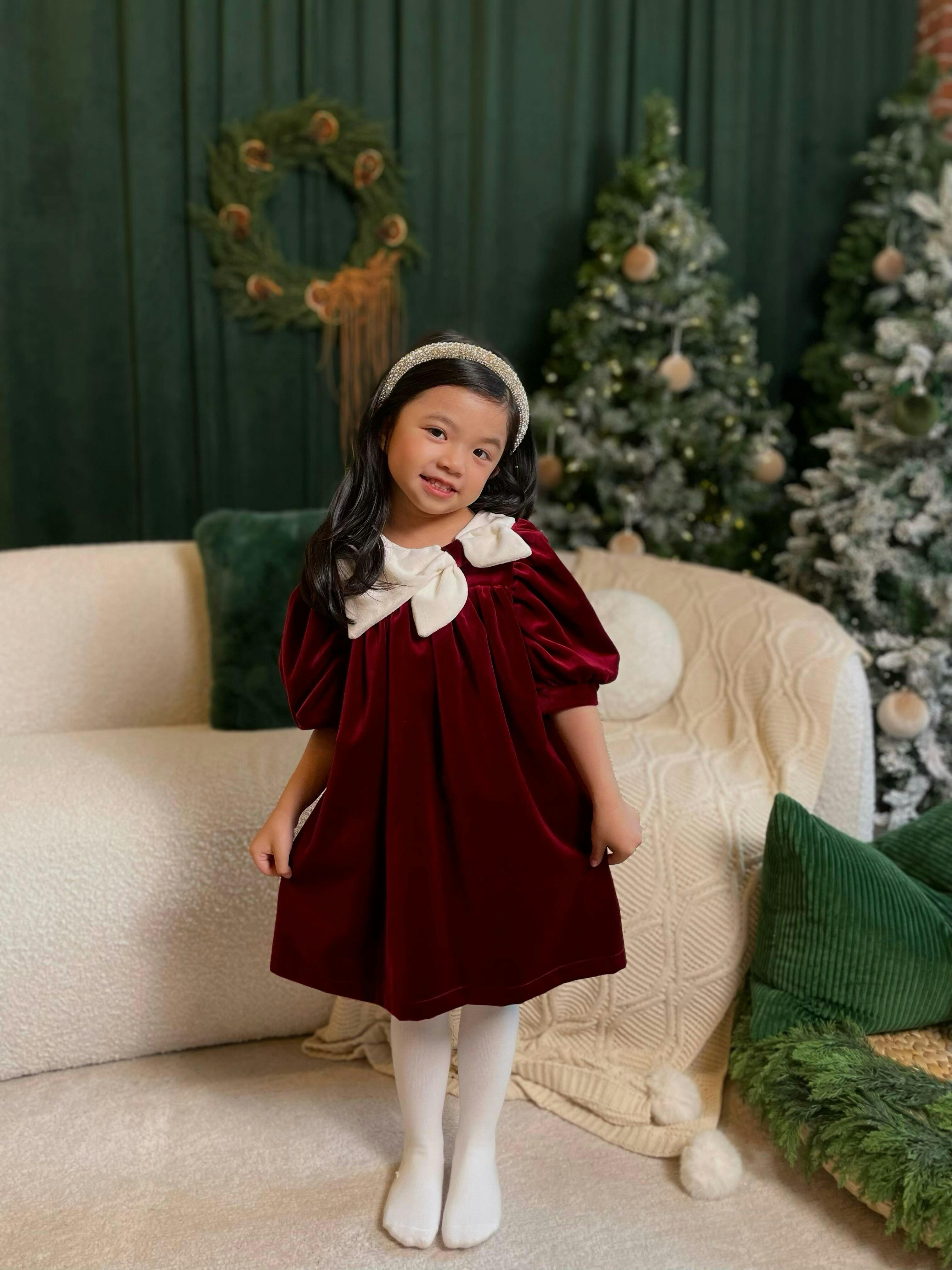 The Rosemoor Dress is crafted from 100% cotton velvet in a rich winterberry red hue, soft weighty and beautifully plush. It’s oversized ivory bow and gently puffed sleeves bring a vintage charm, while the fully lined design ensures comfort for little ones through every festive gathering. At the back, three covered velvet buttons add a delicate finishing touch, completing the design with quiet elegance. The Rosemoor dress is carefully made to last, intended to be loved, worn, and remembered.