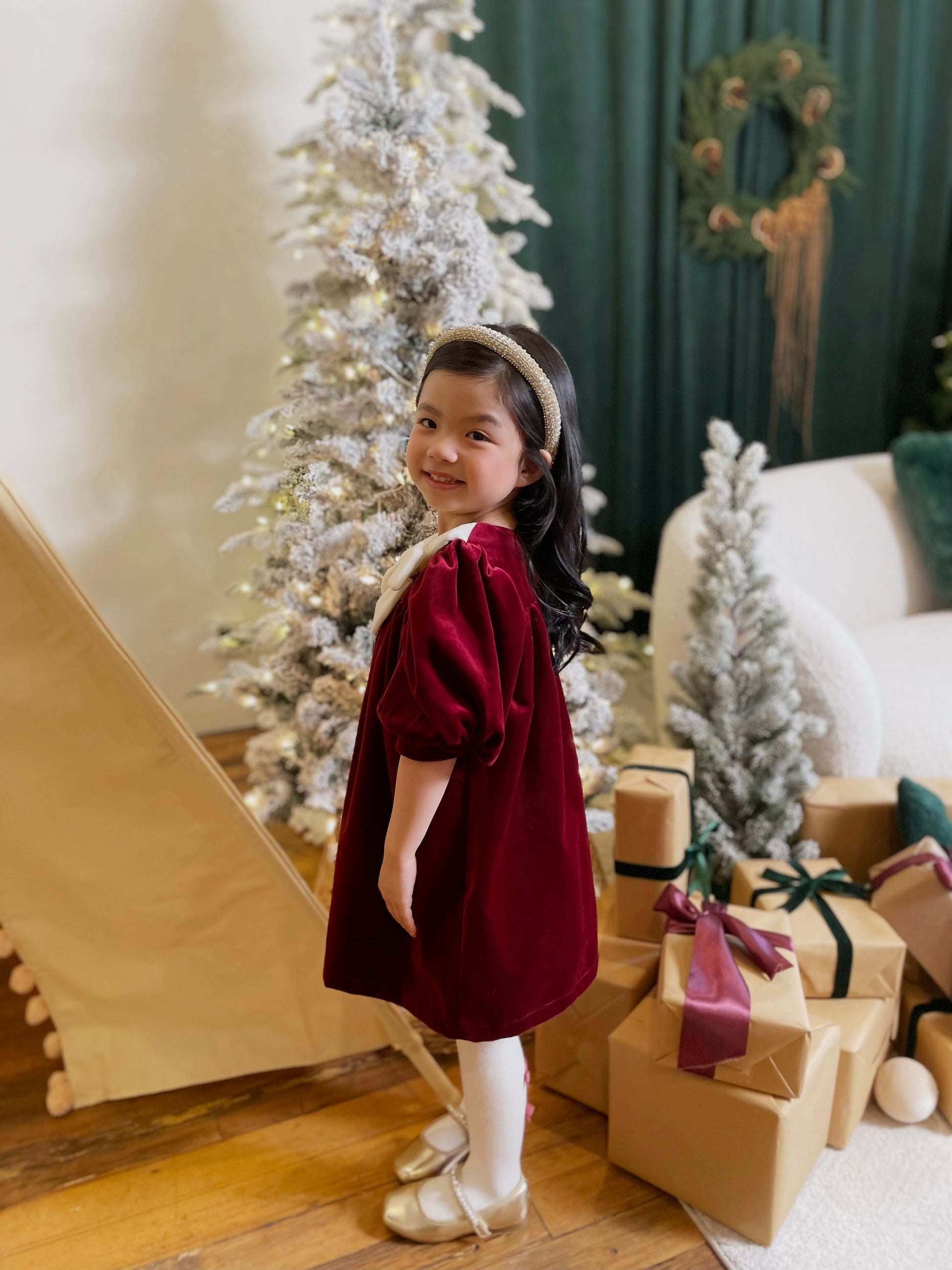 Complete the look with the matching Rosemoor Headband, crafted entirely from the same cotton velvet, the perfect keepsake accessory for the season.