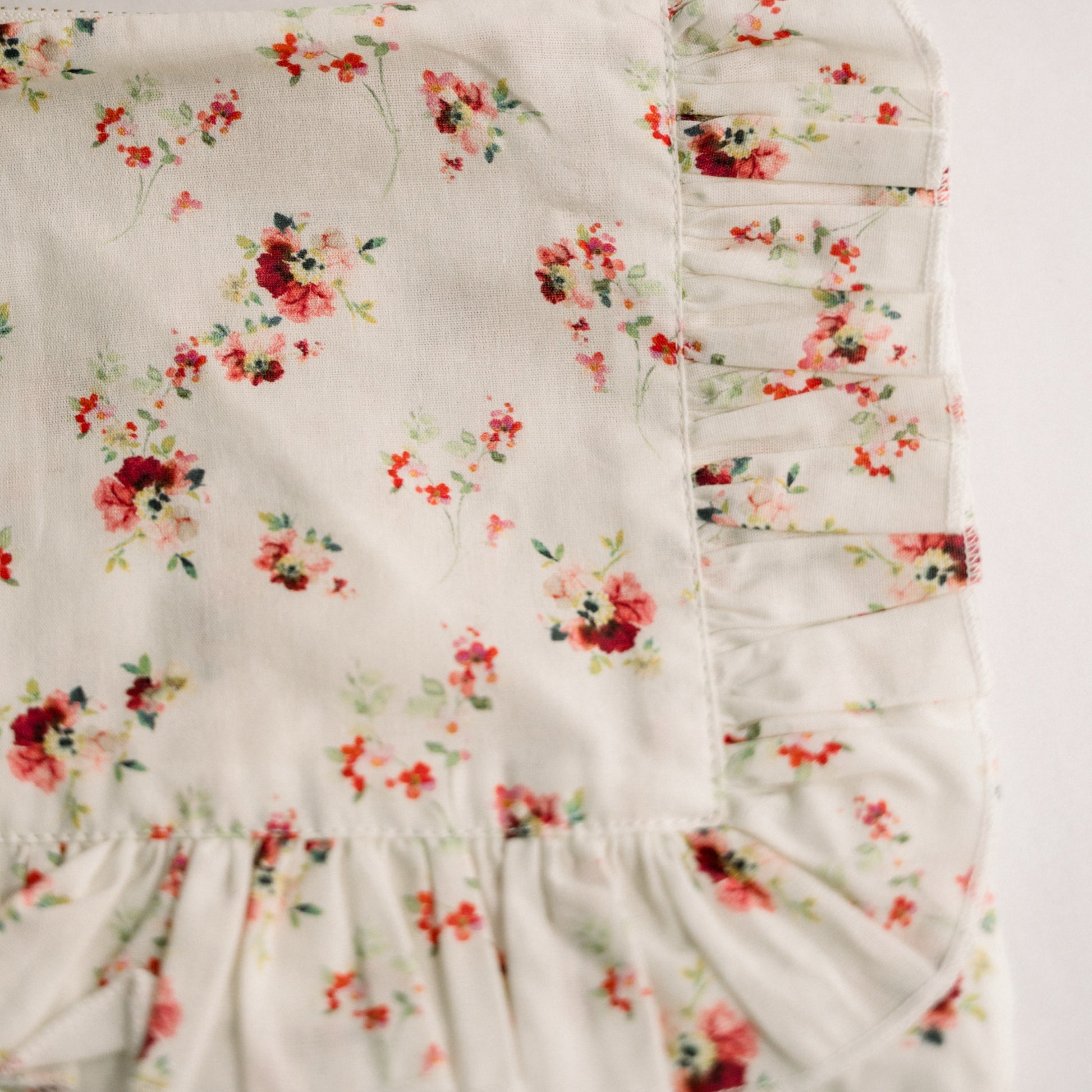 The Scarlet Bloom Ruffle Zipper Pouch is a celebration of vibrant blooms. Timeless charm meets everyday function in this sweet, vintage-inspired floral zippered pouch. Made from soft cotton fabric with a delicate floral print, this pouch features romantic ruffle edging and a smooth brass zipper closure. Perfectly sized for keeping little treasures, pacifiers, hair bows, or mama essentials neatly tucked away.