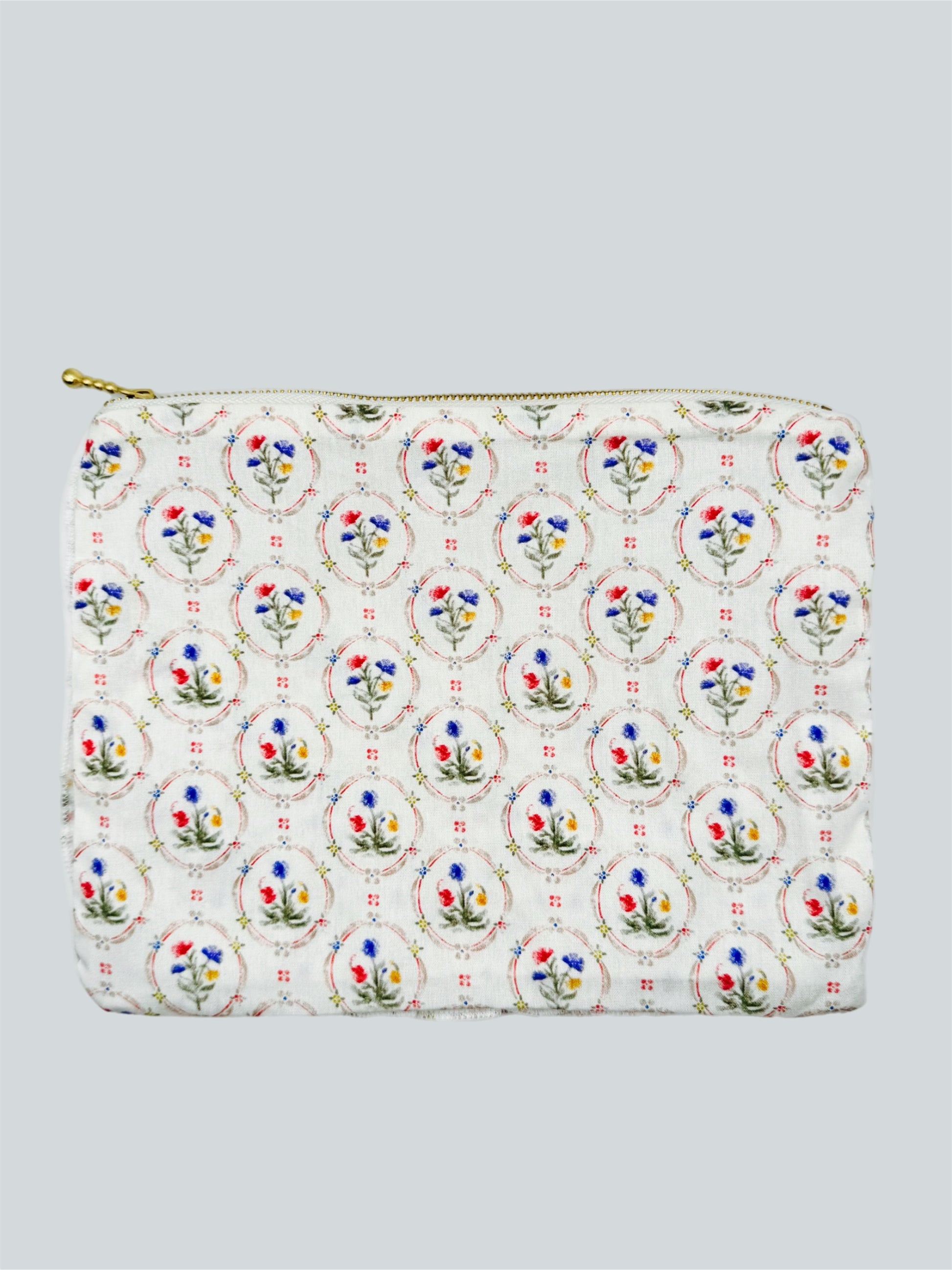 Victorian Garden-Timeless Charm meets everyday function in this sweet, vintage-inspired floral zippered pouch. Made from soft cotton fabric in a Victorian garden print featuring red, blue, and yellow flowers in oval frames on a soft ivory background and a smooth brass zipper closure.